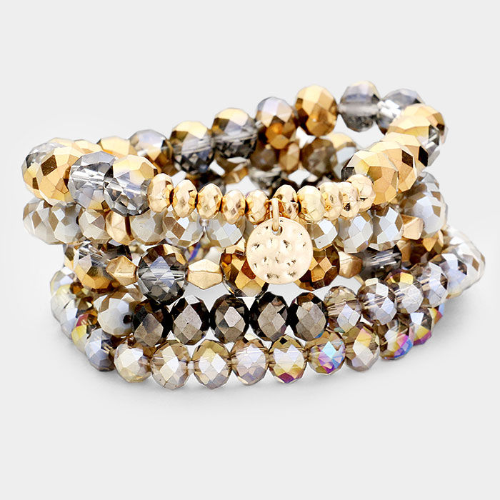 5 PC Multi Glass Beaded Metal Disc Stretch Layered Bracelet Set